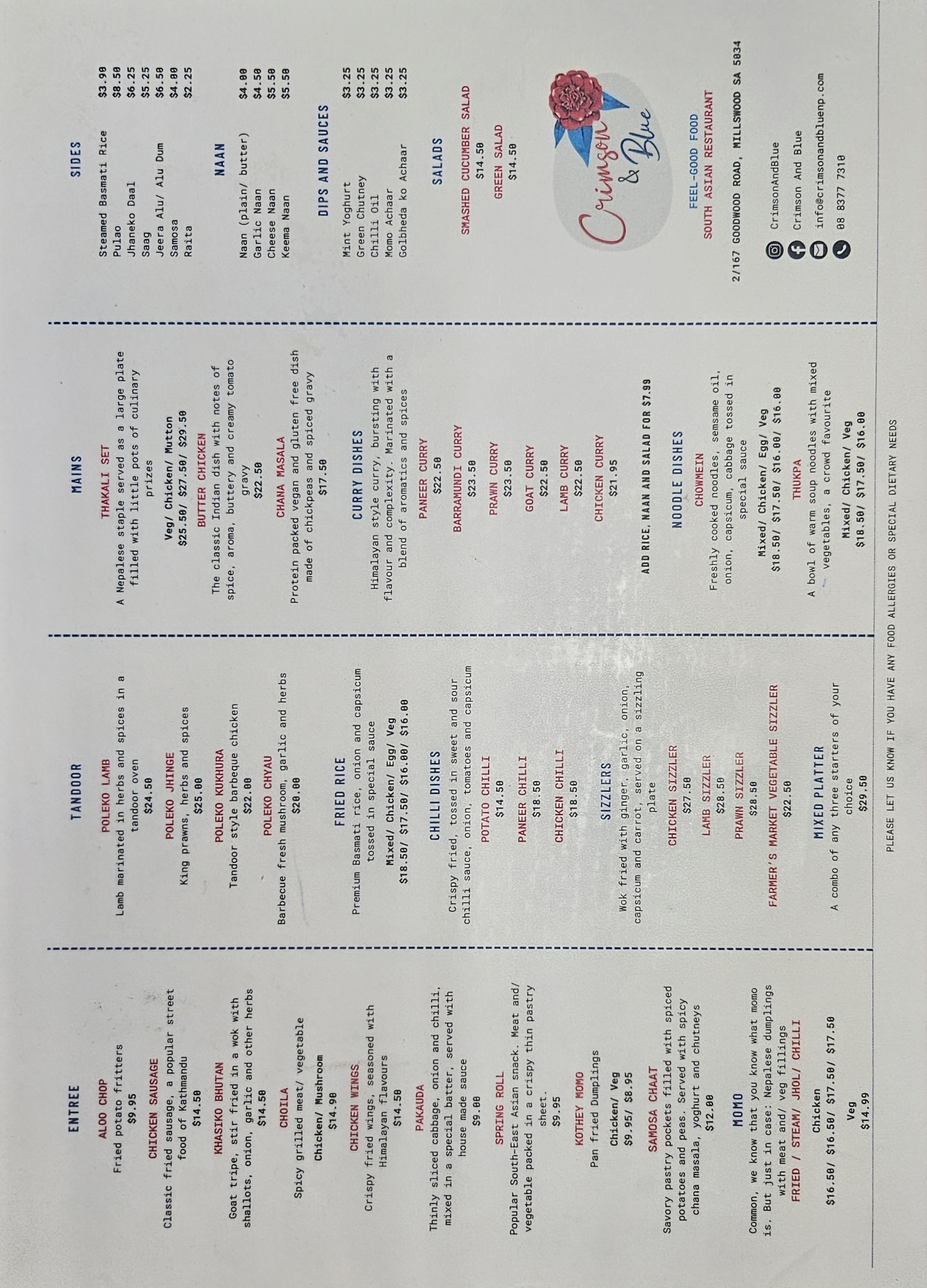 Crimson and Blue is a Restaurant located at 2/167 Goodwood Road, Millswood, South Australia 5034. Crimson and Blue is a popular spot in the Millswood area. Whether you're looking for a light bite or the full foodie experience, explore the dishes at Crimson and Blue and experience authentic Nepalese food in Adelaide.