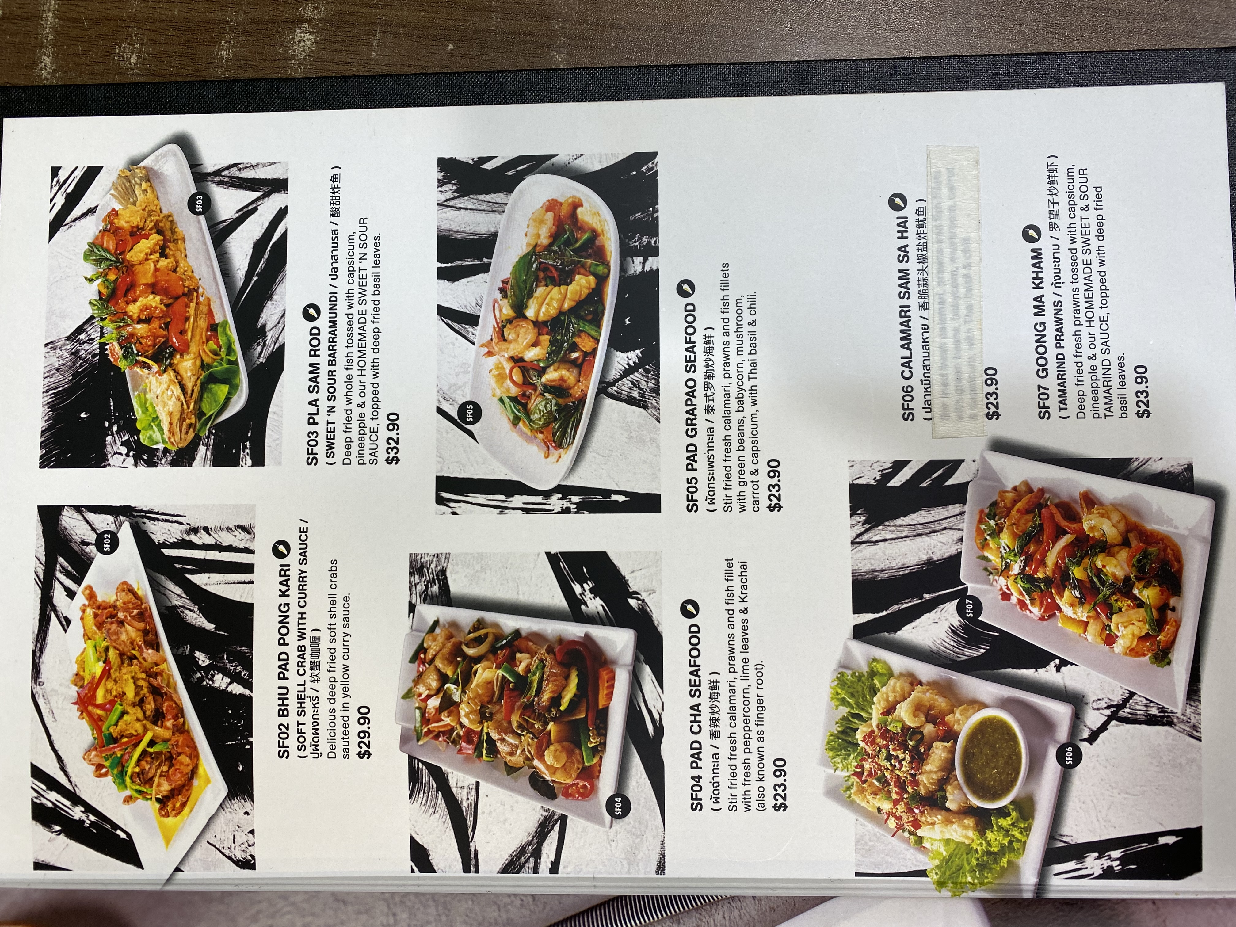 Stir fried fresh calamari, prawns and fish fillet with fresh peppercorn, lime leaves & Krachai (also known as finger root).
