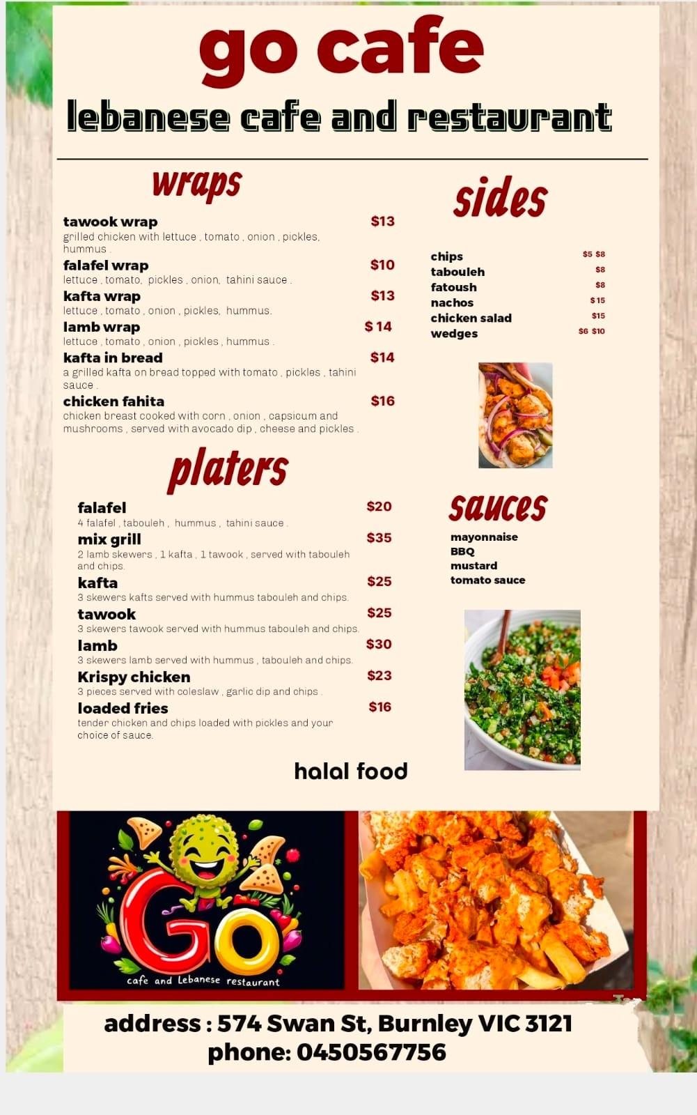 Go Cafe is a Café located at 574 Swan Street, Burnley, Victoria 3121. Go Cafe is a popular spot in the Burnley area. Whether you're looking for a light bite or the full foodie experience, explore the dishes at Go Cafe and experience authentic Lebanese food in Melbourne.