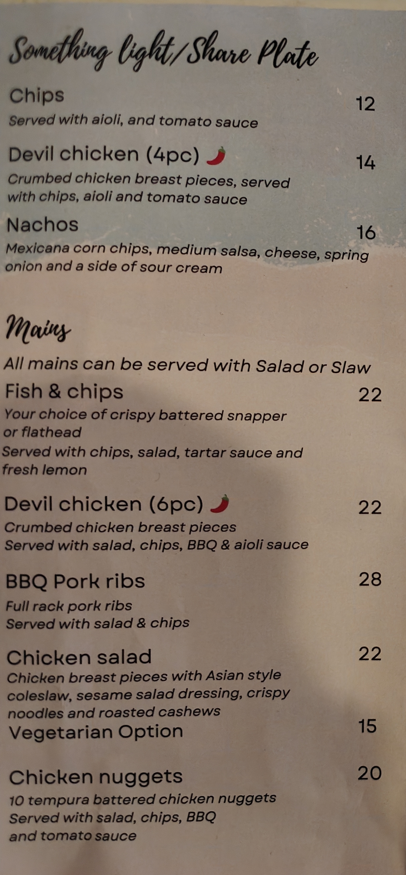 Crumbed chicken breast pieces. Served with chips, salad or slaw, BBQ & aioli sauce