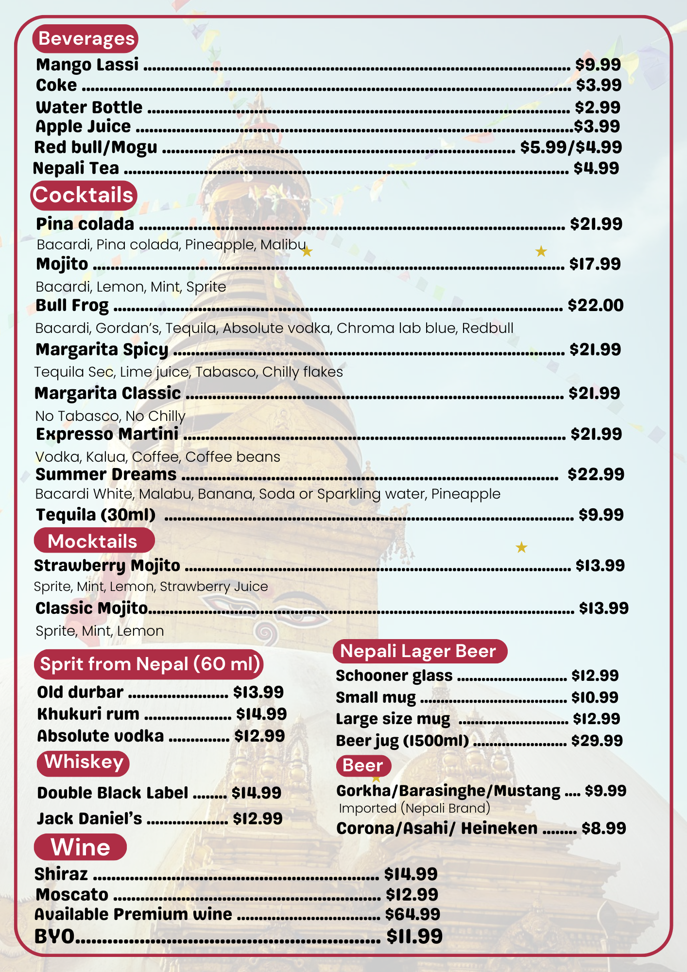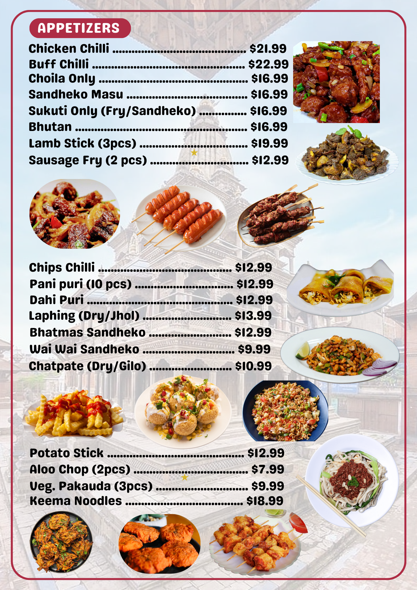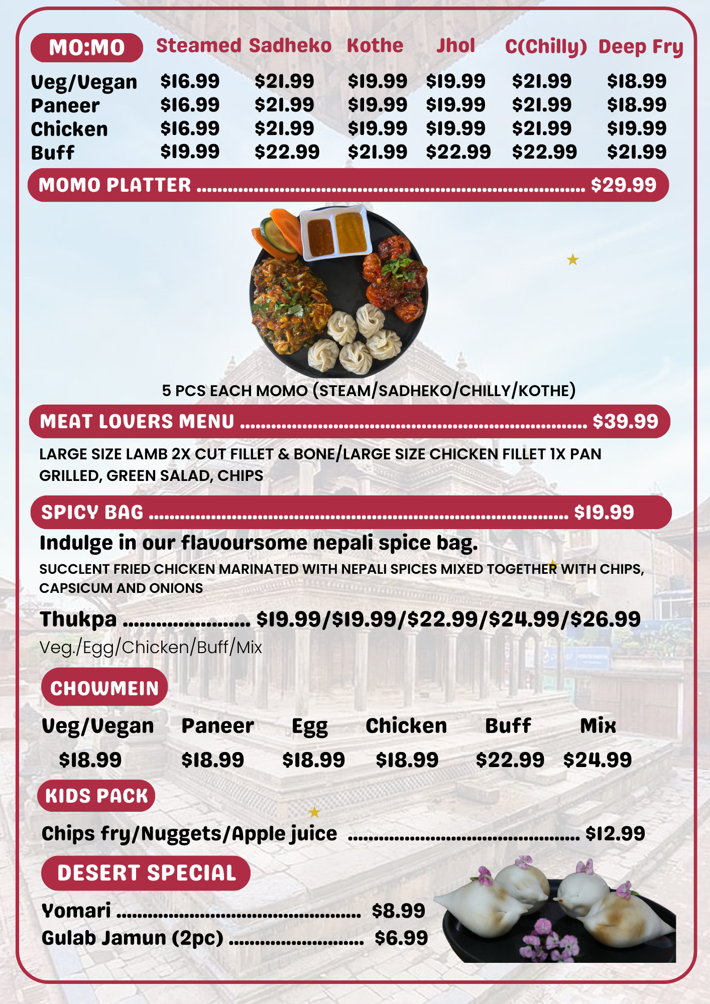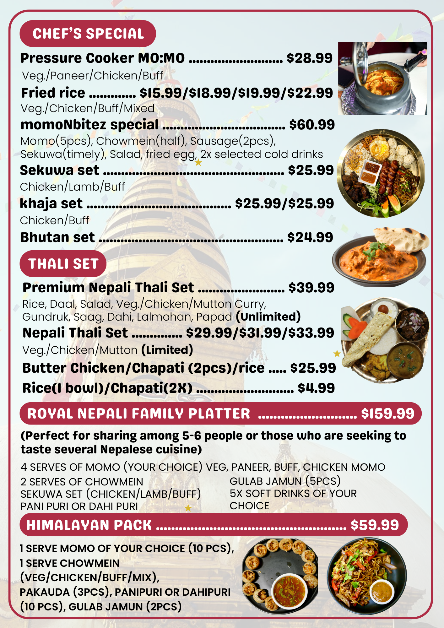 Momo(5pcs), Chowmein(half), Sausage(2pcs), Sekuwa(timely), Salad, fried egg, 2x selected cold drinks