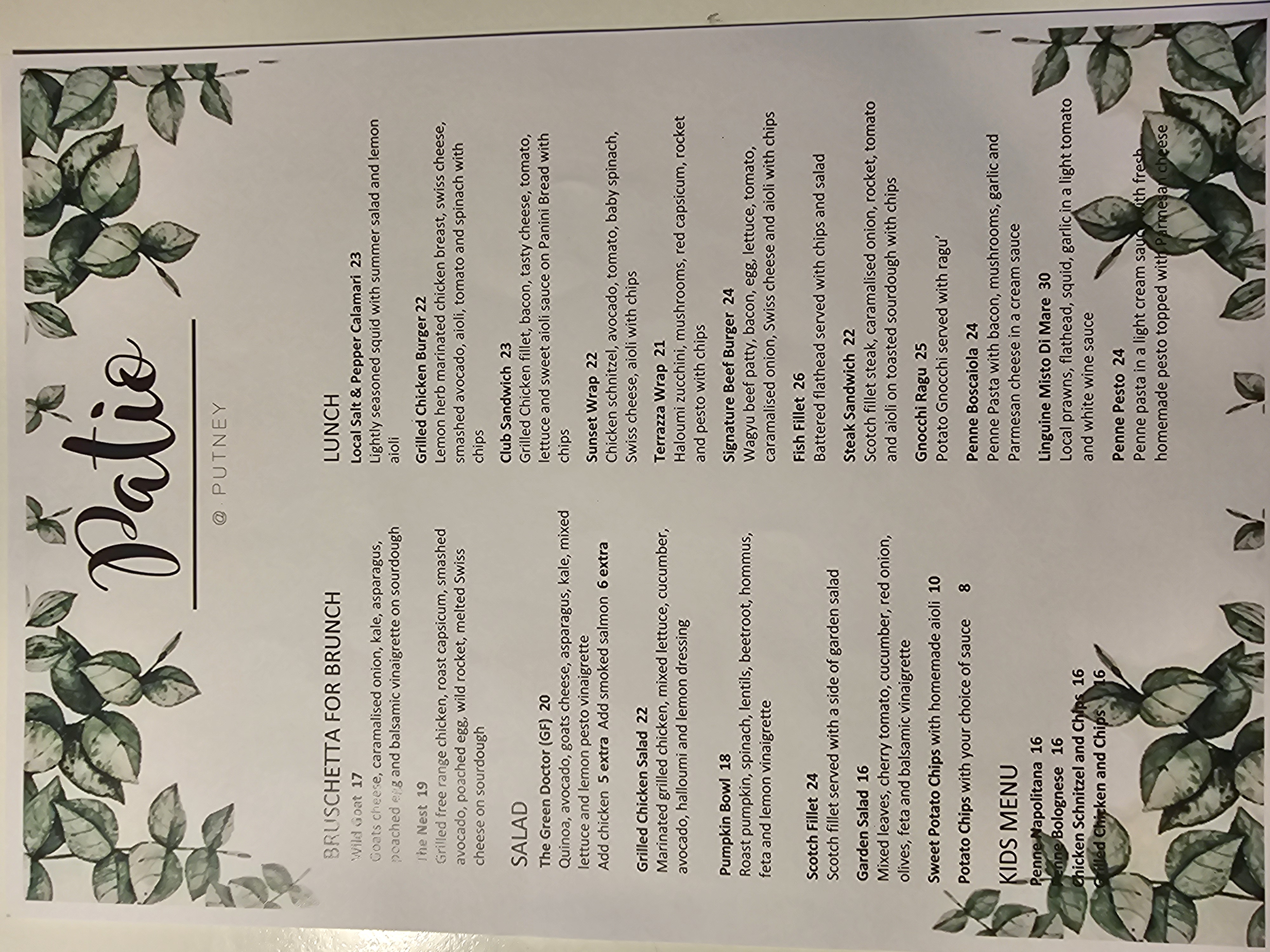 Menu from Patio @ Putney