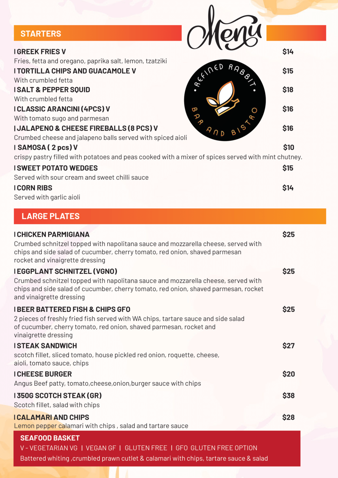 What's the restaurant buzz at Refined Rabbit all about? Great Australian food and beverages keeps diners coming back for more at Refined Rabbit. Located near East Victoria Park in Perth, Refined Rabbit features dishes like Western, European. Check out what sets Refined Rabbit apart from other restaurants in Perth and book a table today to enjoy your next meal out!