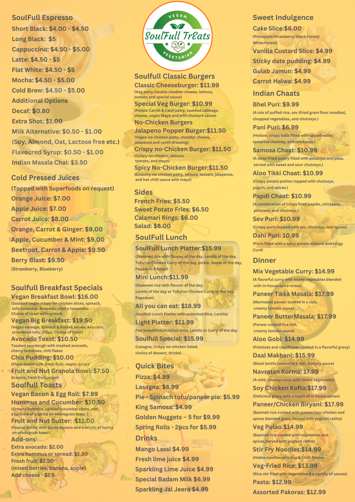 Menu from SoulFull Treats Vegan & Vegetarian Indian & Asian Fusion Restaurant