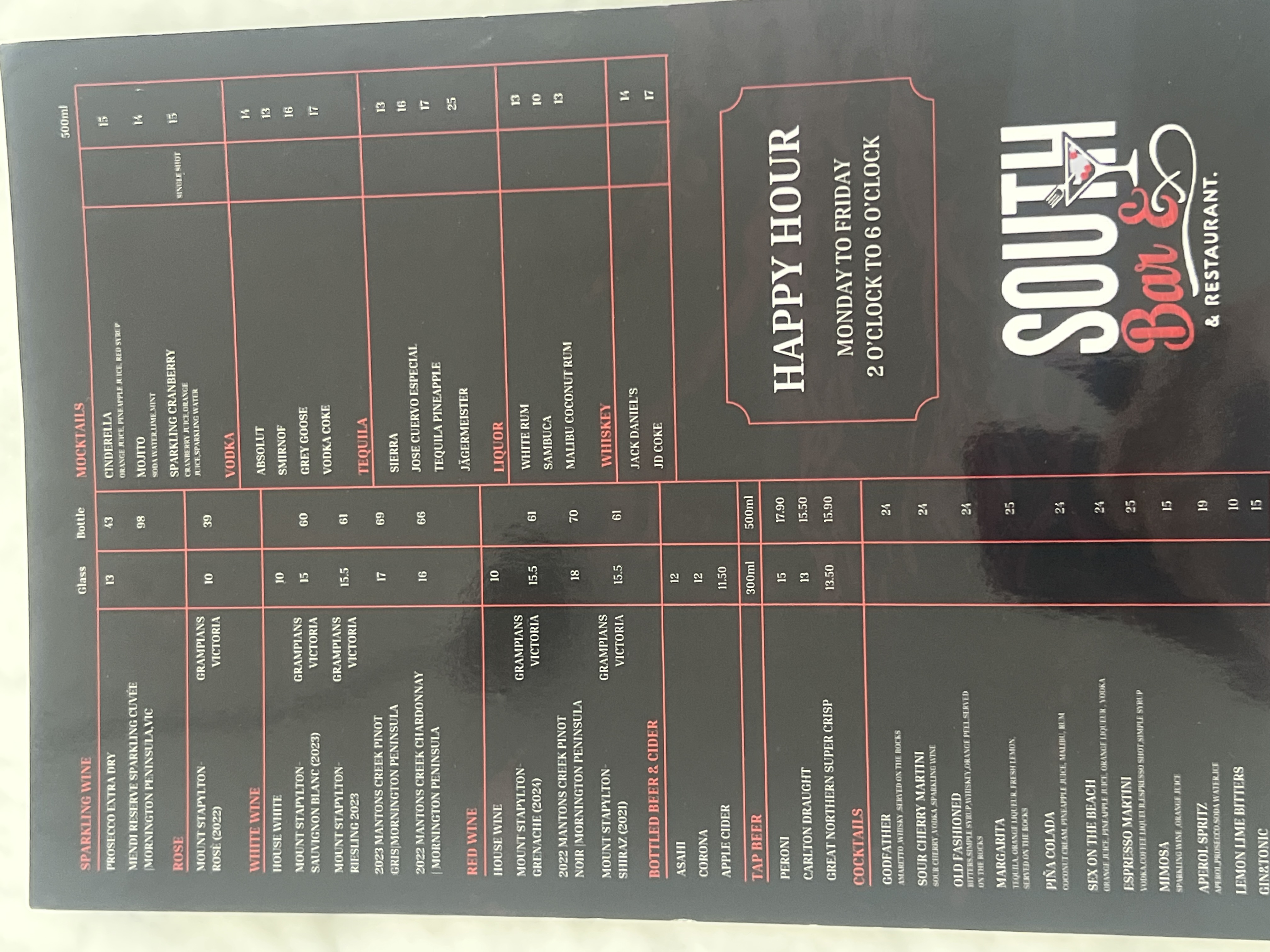 Menu from South Bar and Restaurant
